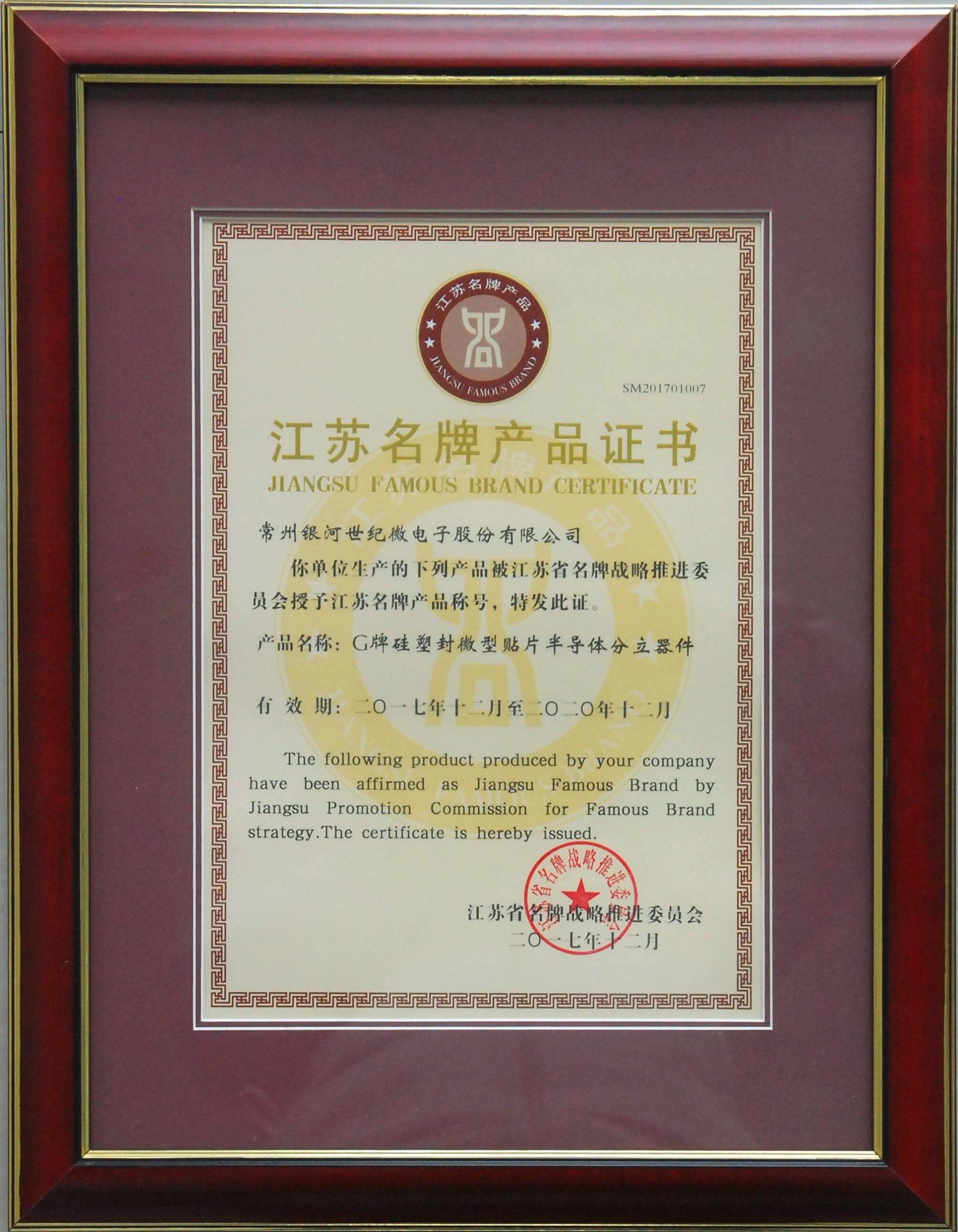 G牌硅塑封微型贴片半导体分立器件获江苏省名牌产品证书